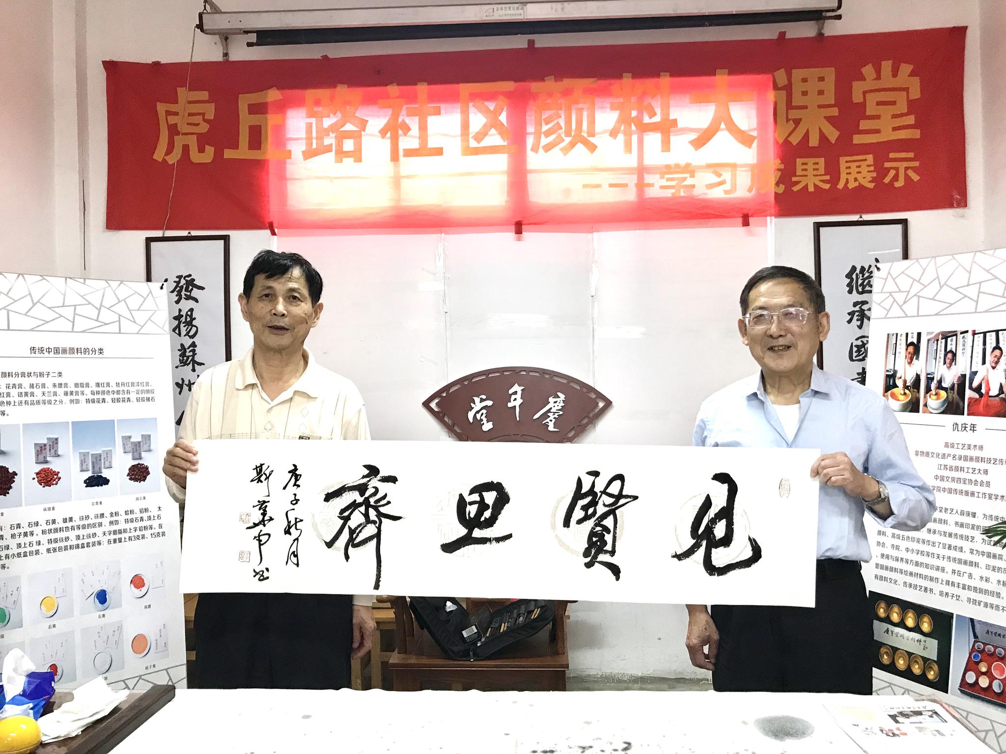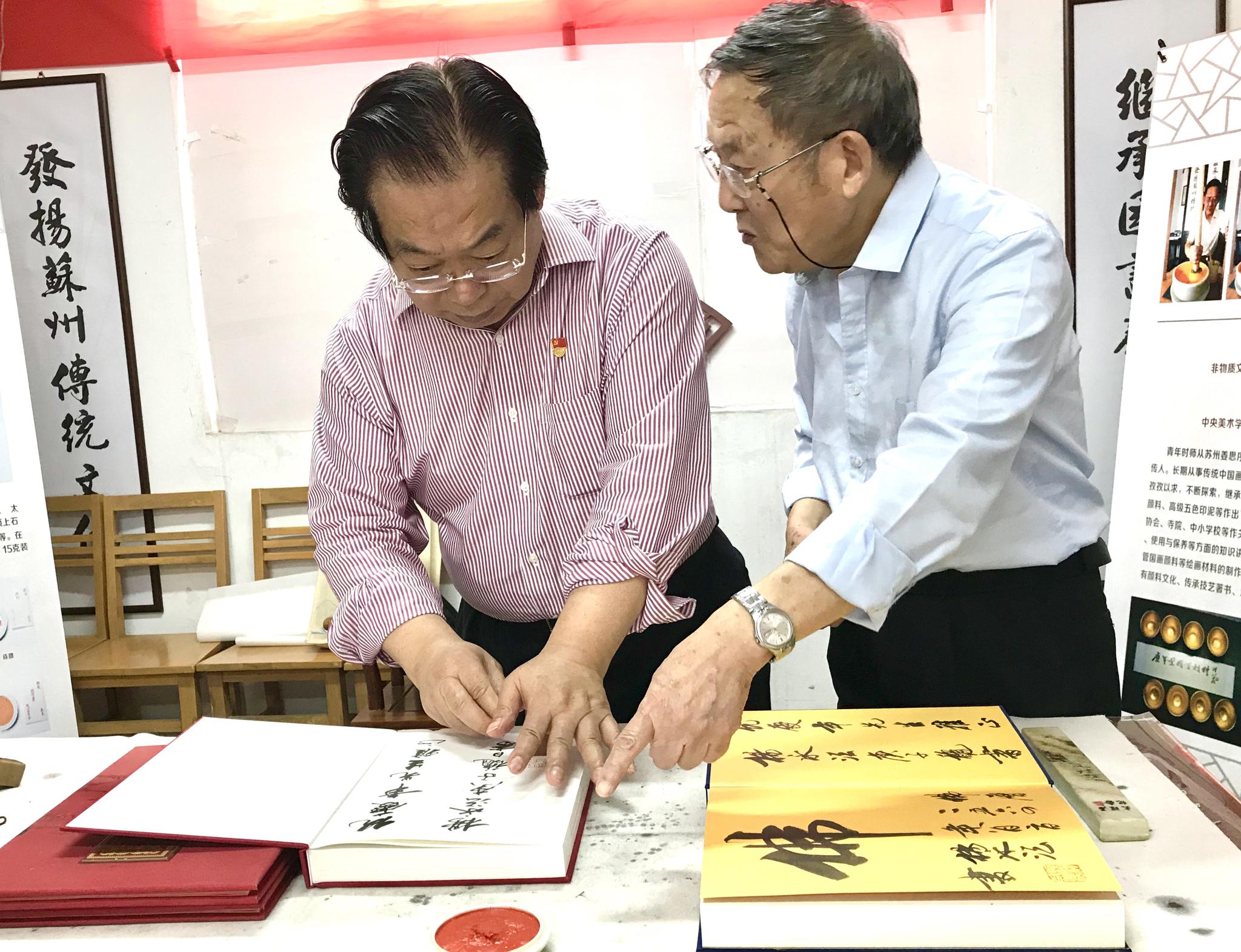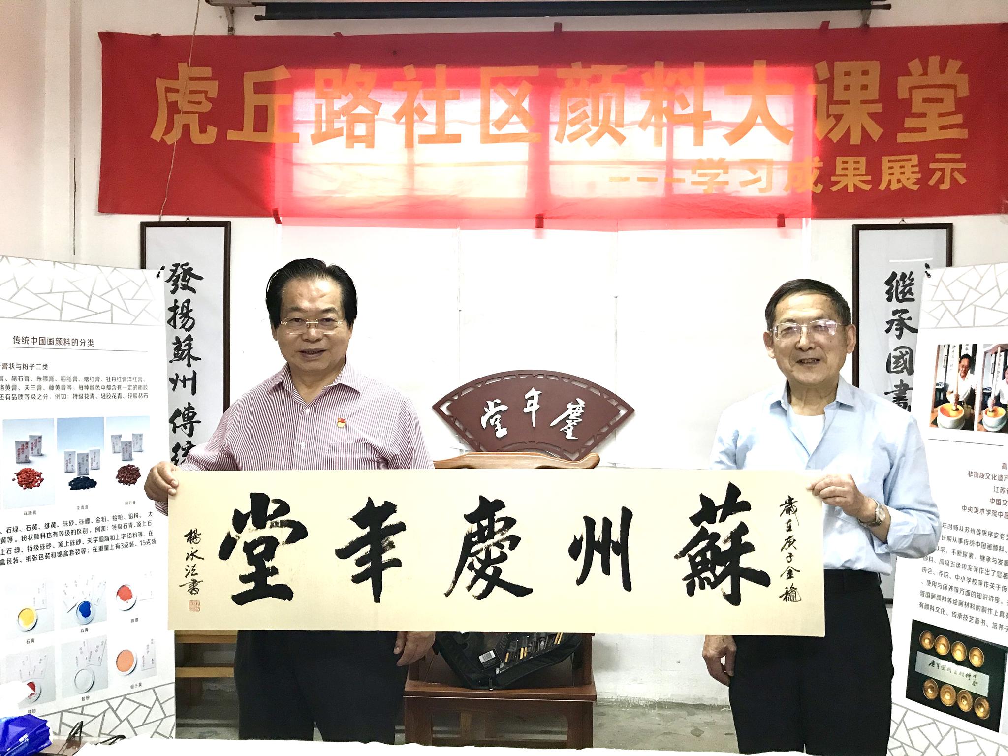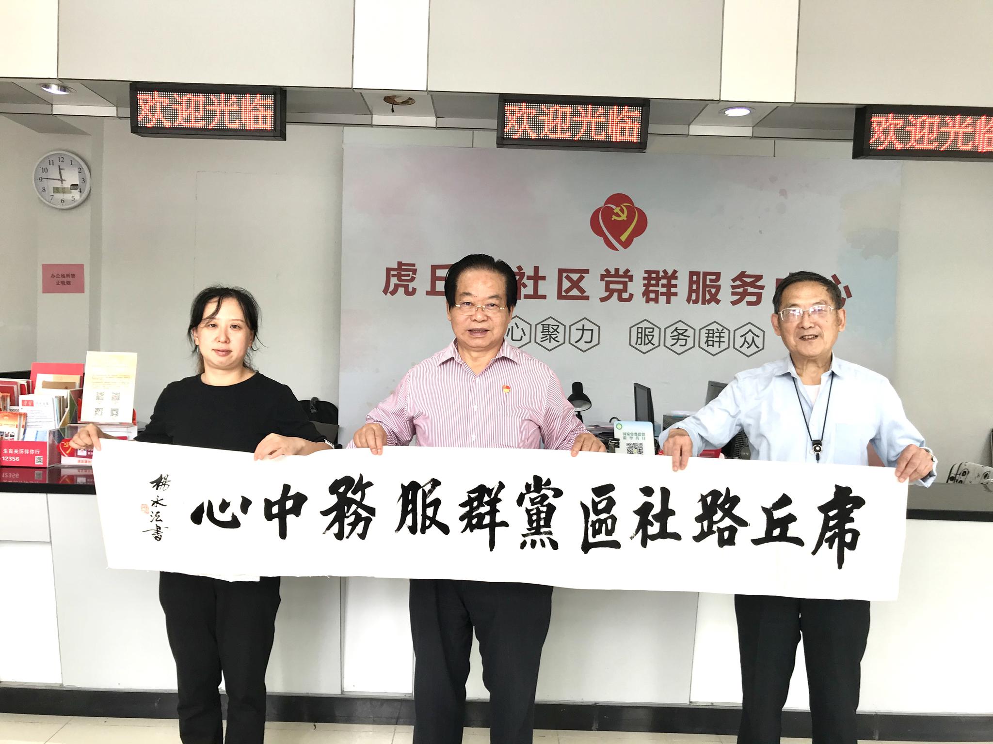 活动期间,党员代表、中国书法家协会会员、永法文创基金会副理事长兼秘书长杨永法向仇庆年赠送由他精心抄录的《苏州庆年堂》(简介)书法作品。此外,杨永法还与党员代表、上海市书法家协会会员、上海航天书法家协会秘书长斯华申在“庆年堂”现场挥毫泼墨,创作书法作品赠送给仇庆年和虎丘路社区党群服务中心。